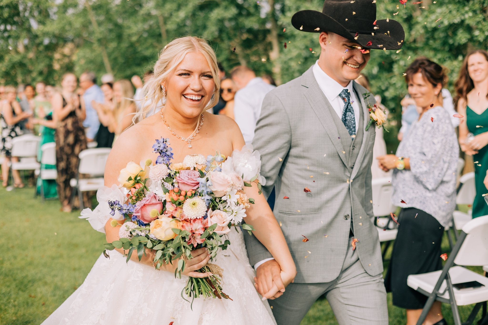 When I walked down the aisle and saw everyone we love gathered there, I felt completely surrounded by support, by joy, by so much love. And then, as if the moment needed one more touch of magic, cotton floated down from the trees during our petal toss. We couldn’t have planned it if we tried.